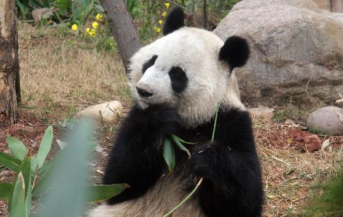 Der Riesenpanda Mei Lan isst Bambus in der Pandazuchtstation in Chengdu, der Hauptstadt der südwestchinesischen Provinz Sichuan, am 15. März 2010.