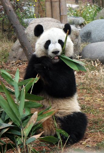 Der Riesenpanda Mei Lan isst Bambus in der Pandazuchtstation in Chengdu, der Hauptstadt der südwestchinesischen Provinz Sichuan, am 15. März 2010.