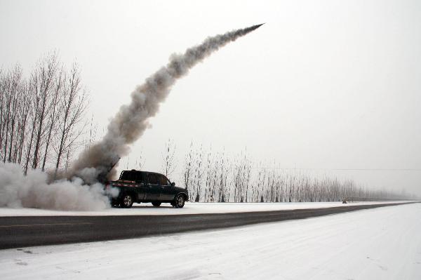 Eine Rakete zur Wetterbeeinflussung wird in der Stadt Liaocheng in der ostchinesischen Provinz Shandong abgefeuert. Das lokale Wetteramt hat am Sonntag künstlich Schneefall ausgelöst, um die Dürre in der Region zu lindern.