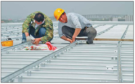 Die Arbeiter installieren Solarzellenplatten auf dem Bahnhof Beijing Süd.