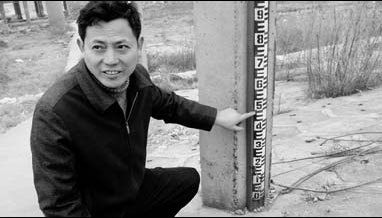 Bao Chunhong, Direktor der hydrometrischen Station Xingzi, zeigt an einer Messlatte den Wasserstand von früher an.