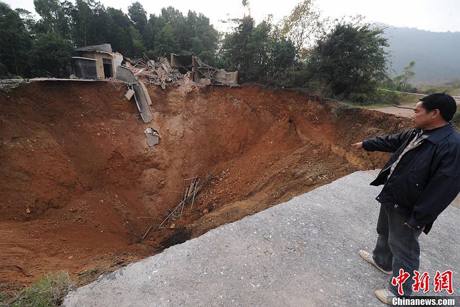 11月19日,湖南长沙岳麓区雨敞坪镇泉宏村的村民带领记者来到村内塌陷的大坑前。据泉宏村村民介绍,16日凌晨正值雨夜,当地村民发现了地面塌陷形成的大坑,坑洞且不断蔓延扩大。一天后,坑洞已将两层楼房“吞噬”。大坑面积约200平方米、深约30米。