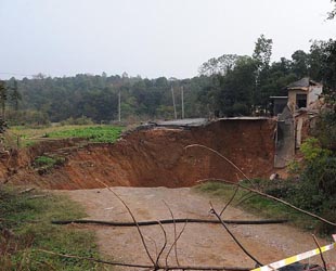 Am vergangenen Freitag haben schwere Regenfälle in der Nähe der südchinesischen Stadt Changsha (Provinz Hunan) zu einer massiven Absenkung des Bodens geführt. Ein Erdloch mit einer Fläche von 200 Quadratmetern und einer Tiefe von 30 Metern verschluckte ein zweistöckiges Gebäude.
