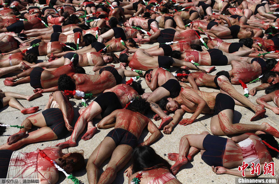 Am Sonntag protestierten zahlreiche Tierschützer halbnackt in Mexiko-Stadt gegen den Stierkampf. Mit rot beschmierten Oberkörpern spielten sie auf der Straße einen sterbenden Stier.