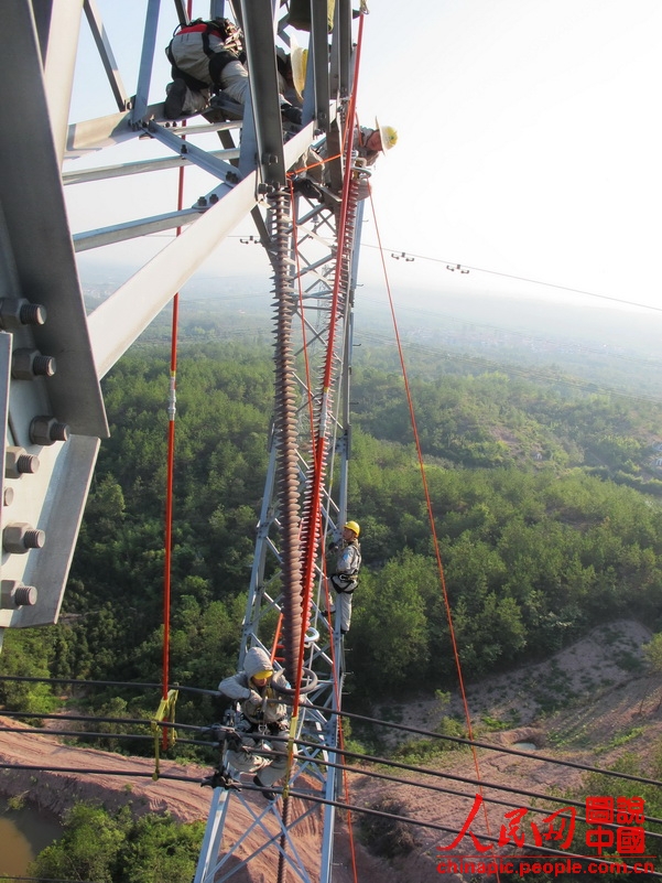 Hochspannungselektriker. 40 Grad, Shaoxing, Zhejiang.