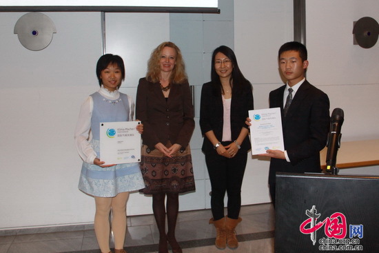 Frau Daniela Clauss (2.v.l.), Schirmherrin des Projekts "Klima-Macher! International", Zhang Yan (3.v.l.) von der Stiftung Mercator und zwei Vertreterschüler der Siegerschule, der Wuhan Changqing No. 1 School.