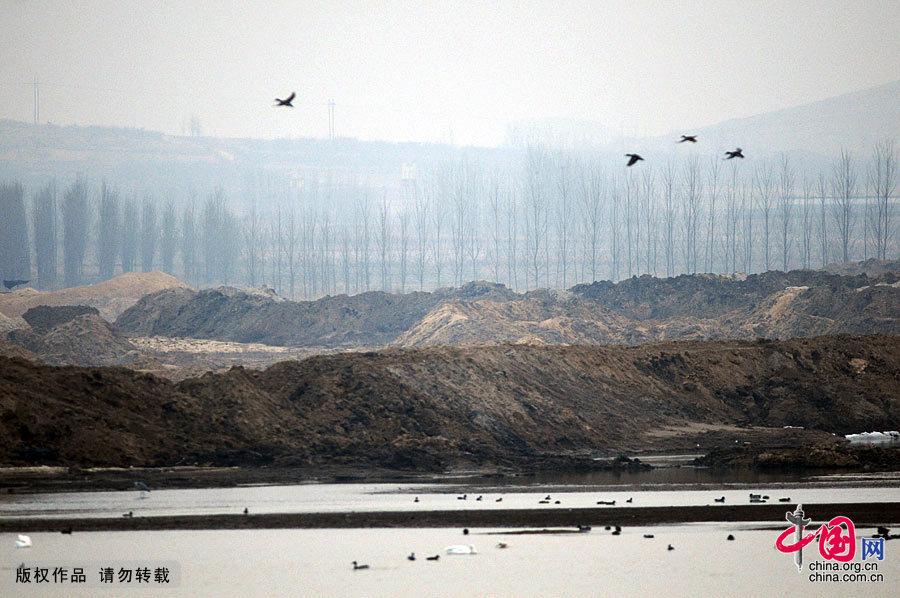 Stromaufwärts vom Yinfu-Reservoir gibt es für die Zugvögel nur einen begrenzten Wasserbereich im Feuchtgebiet, der von Baggerarbeitern zurückgelassen wurde.