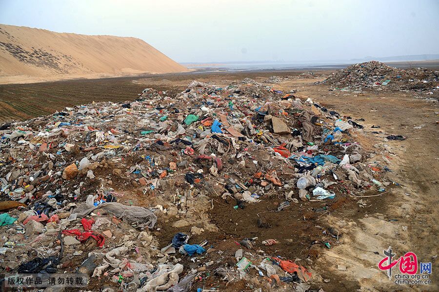 Eine Seite des Flusses im Yinfu-Reservoir, das als Wasserquelle für die Stadt Pingdu dient, wurde mit jeder Menge Hausmüll verschmutzt.