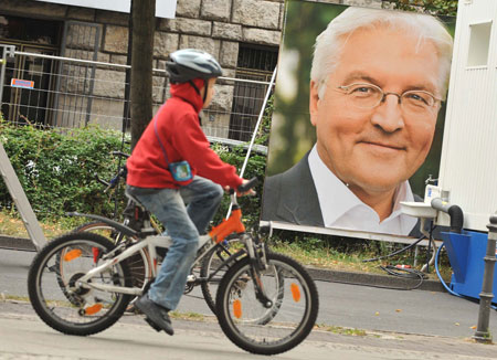 Ein Junge fährt mit seinem Fahrrad an einem Poster von Frank-Walter Steinmeier, Vorsitzender der SPD, in Berlin vorbei (26. September 2009). Deutschland wählte am Sonntag den neuen Bundestag.