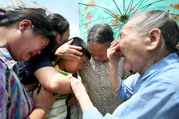 Angehörige eines entführten Jungen können ihre Tränen nicht zurückhalten, als ihr Kind am 4. August von der Polizei befreit und nach Hause in den Autonomen Bezirk Du’an im Autonomen Gebiet Guangxi Zhuang gebracht wird. (Mo Xiantao / Xinhua)