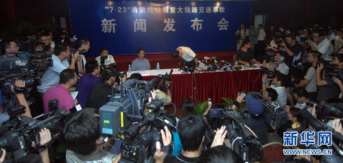 Die Pressekonferenz des chinesischen Eisenbahnministeriums fand um 22.41 Uhr in der Nacht auf Montag in Wenzhou in der ostchinesischen Provinz Zhejiang statt, wo sich das tödliche Zugunglück einen Tag zuvor ereignet hatte. Mit einer tiefen Verbeugung begann Wang Yongping, der Pressesprecher des Ministeriums, vor zahlreichen Kameras mit der Entschuldigung.