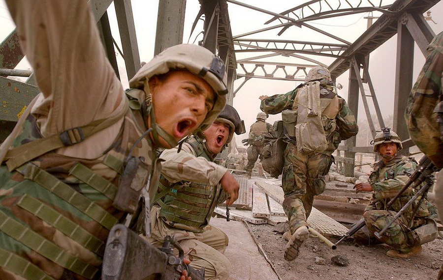 11. 7. April 2003: US-Soldaten drängen ihre Kameraden, schnell über die beschädigte Autobahnbrücke zu gehen. Unterwegs wurden sie von irakischer Seite angegriffen.