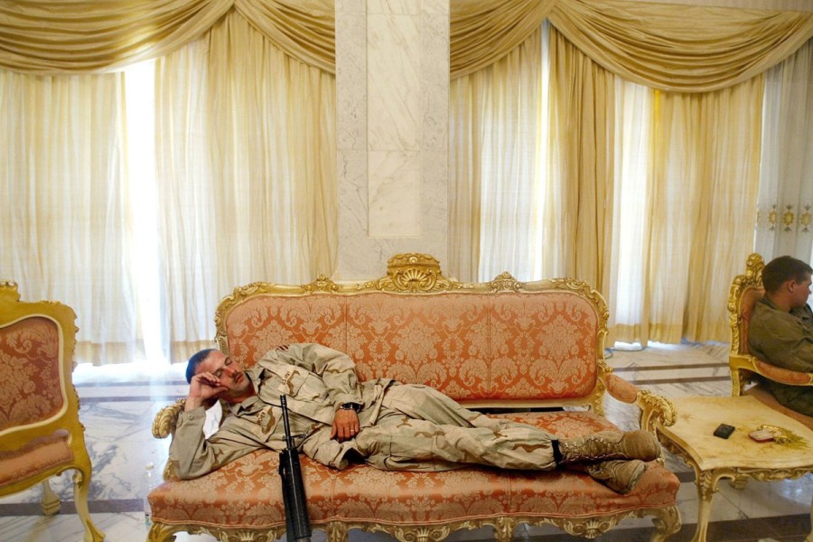 21. Ein US-Soldat schläft auf einem Sofa in der Ex-Residenz von Saddam Hussein.