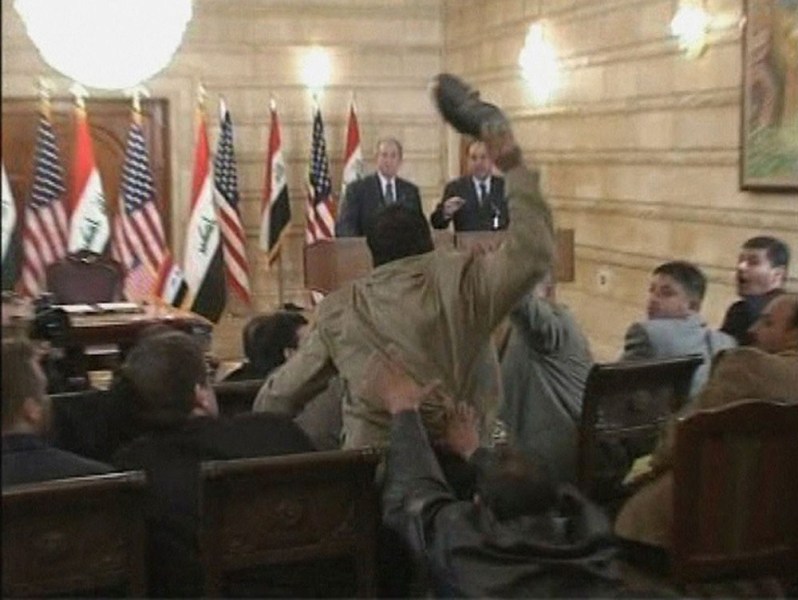38. Die US-Regierung muss zugeben, die Massenvernichtungswaffen nicht gefunden zu haben. Die Beziehung zwischen dem Hussein-Regime mit islamischen Terroristen wurde ebenfalls übertrieben. Am 14. Dezember 2008 warf ein irakischer Journalist seine Schuhe auf den damaligen US-Präsidenten George W. Bush, als er mit dem irakischen Premierminister eine Pressekonferenz abhielt.