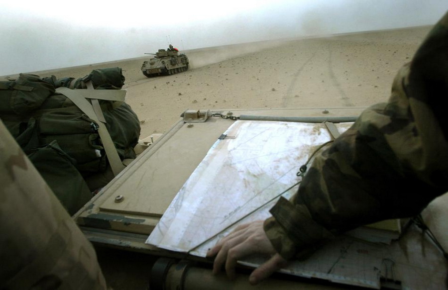 5. 21. März 2003: US-Truppen auf dem Weg zu einem militärischen Ziel. Die Bodenoffensive sollte zunächst zeitgleich mit den Luftangriffen gestartet werden, doch US-Oberbefehlshaber Tommy Franks änderte den Plan. Nach Angaben eines hochrangigen US-Militärsprechers hätten die Amerikaner befürchtet, die Ölfelder des Irak bei einem derartigen Angriff in Brand zu setzen.