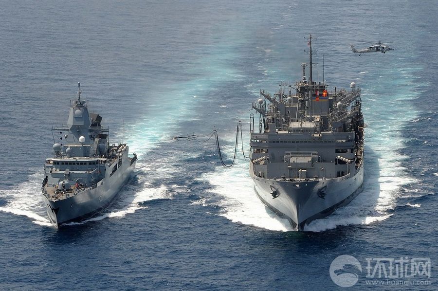 Der US-amerikanische Flugzeugträger "Eisenhower" hat am vergangenen Wochenende im Arabischen Meer die Versorgung während der Fahrt geübt. Merkwürdig war, dass eine deutsche Fregatte dem großen Schiff dabei Geleitschutz bot.