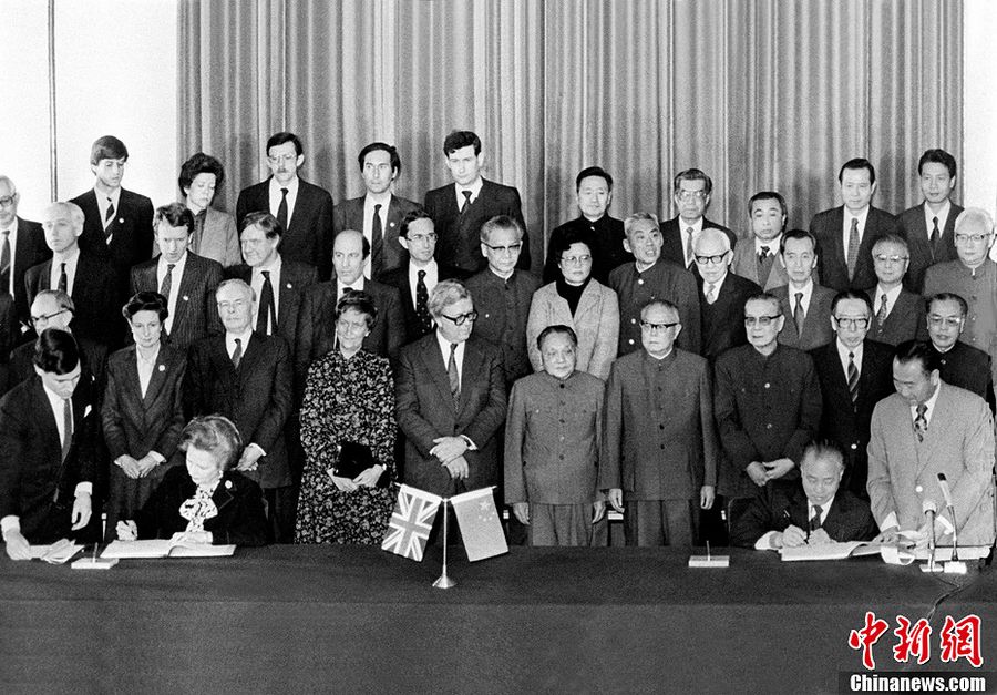 Am 19. Dezember 1984 unterzeichnete Margaret Thatcher in Beijing die "chinesisch-britische gemeinsame Erklärung", die die Rückgabe von Hongkong für den 1. Juli 1997 festlegt.