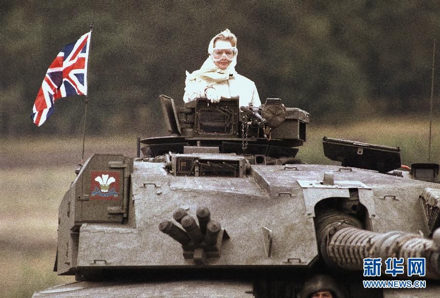 17. September 1986, Margaret Thatcher auf einem britischen Panzer in Bad Fallingbostel, BRD.