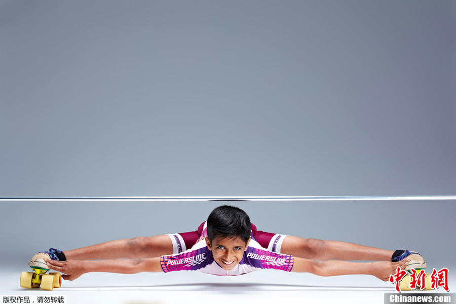 Der Junge schafft einen Inlineskating-Rekord, indem er unter der tiefsten Stange durchläuft.