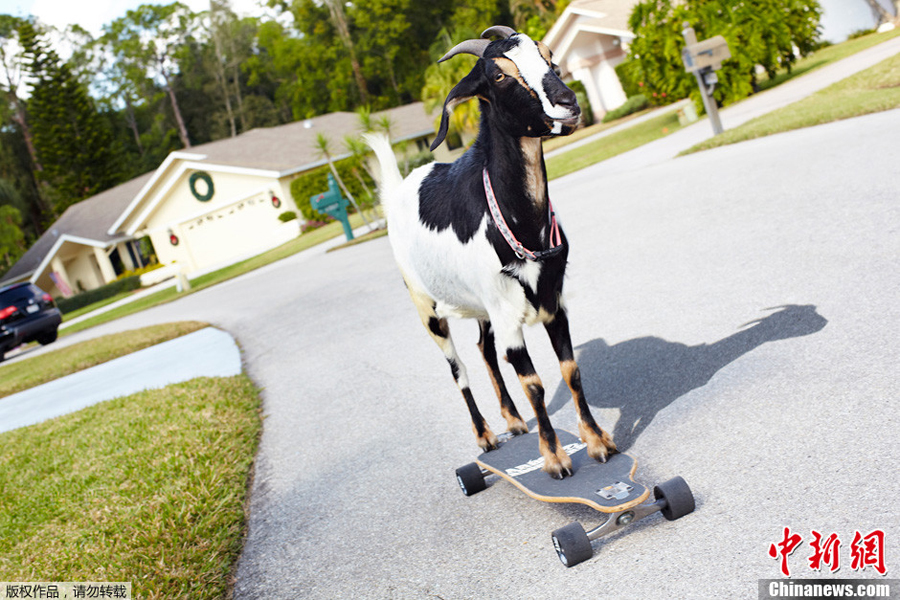 Eine Ziege fährt die längste Strecke mit einem Skateboard.
