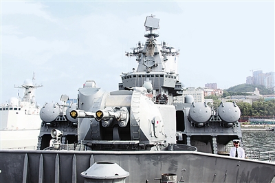 Die 186,4 Meter lange Warjag, ist das Flaggschiff der Pazifikflotte Russlands. Seine Wasserverdrängung beträgt 11.500 Tonnen. Ein so großes Schiff ist definitiv auch mit starken Waffen ausgerüstet. Die acht Doppel-Starter supersonischer Seezielflugkörper SS-N-12 auf den beiden Seiten des Buges sind mit festen Einfallswinkeln übereinandergestapelt. Sie haben besonders dicke Rohre. Damit sehen sie aus wie muskulöse Schultern, die die beiden Seiten des Schiffes schützen. Zusammen mit den komplizierten Radarsystemen in der Mitte des Schiffes zeigen sie die Herkuft der Schiffe der Slawa-Klasse.