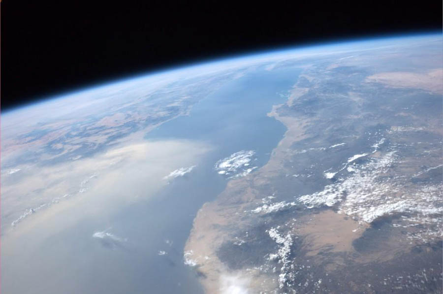 Der auf dem Afrikanischen Kontinent entstehende Sandsturm fegt über das Rote Meer.