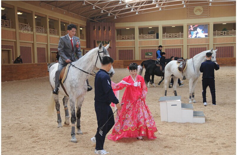 Zwei Neuvermählte lassen sich in einem Reiterhaus fotografieren.