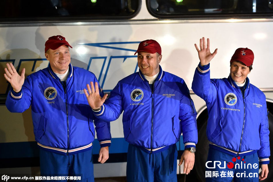 Drei Astronauten bei einer Start-Zeremonie am Weltraumbahnhof Baikonur. (Foto:23. Nov.2014)