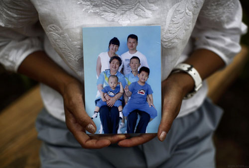 Cheng Liping, deren Ehemann an Bord des am 8. März verschwundenen Flugs MH 370 war, zeigt bei einem Interview in Beijing am 24. Juli ein Familienfoto.