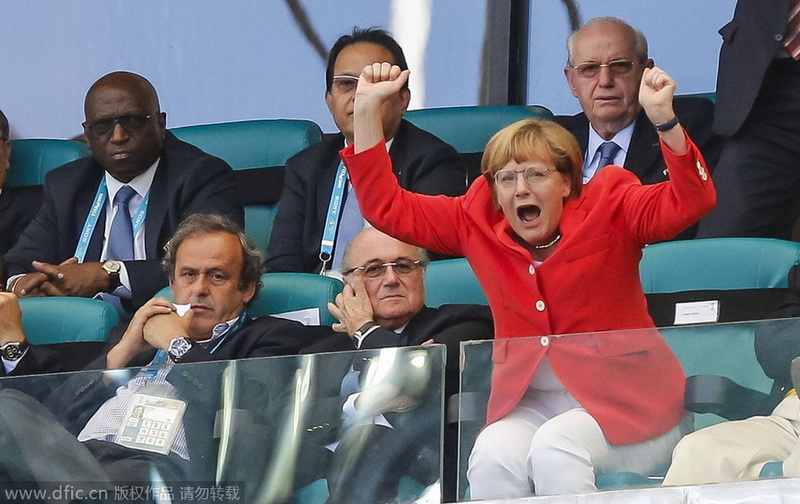 2. Merkel jubelte, als sie sich am 16. Juni 2014 beim Staatsbesuch in Brasilien das WM-Gruppenspiel zwischen Deutschland und Portugal anschaute. Bei diesem Wettkampf hat die deutsche Nationalelf ihren Gegner mit 4:0 geschlagen. (imago sportfotodienst/ IC)
