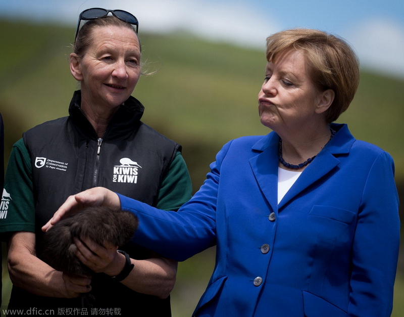 5. Die Kanzlerin zeigte diese Mimik, als sie am 14. November 2014 bei ihrem Neuseeland-Besuch einen Kiwis streichelte. (KAY NIETFELD/ IC)