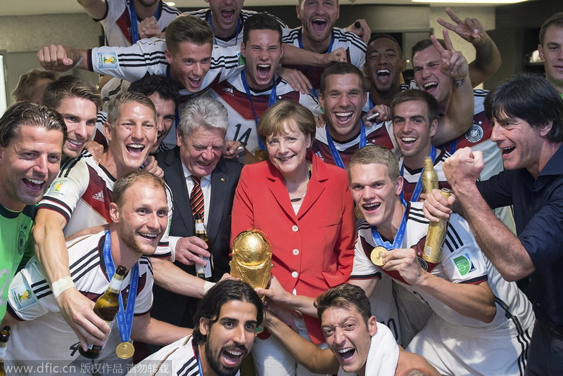 6. Das Gruppenfoto von Merkel, Gauck und der deutschen Fußballmannschaft nach dem Triumph am 13. Juli 2014 bei der WM in Brasilien. (Guido Bergmann/ IC)