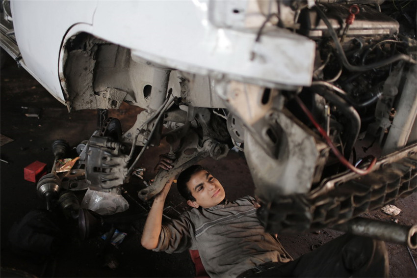Am 7. April 2014 arbeitet ein 12-Jähriger in einer Autowerkstatt in der Stadt Gaza.