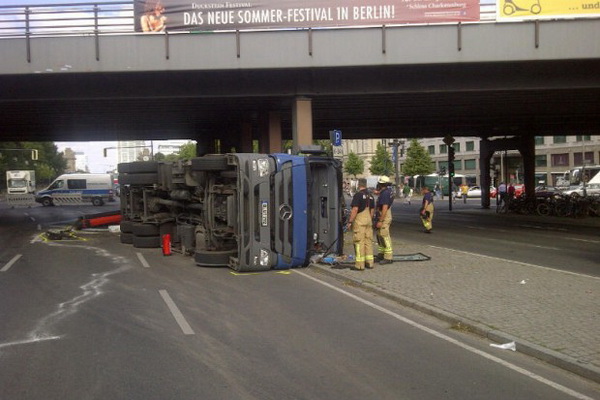 据德国《世界报》7月21日报道,当地时间周六早上7点50左右,德国柏林蒂尔加滕城铁站附近发生了一起严重的交通事故,一名卡车司机在过城铁桥洞时对限高估计错误,全速行驶撞上桥洞,导致车辆向左侧翻,在桥洞下滑行,最终横卧在车道上。