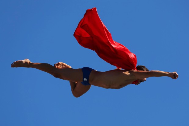 据德国《世界报》1日报道,在巴塞罗那游泳世锦赛期间的一场表演赛中,一位来自捷克的悬崖跳水运动员身披红衣模仿超人,从27米高的跳台一跃而下,令现场观众叹为观止。