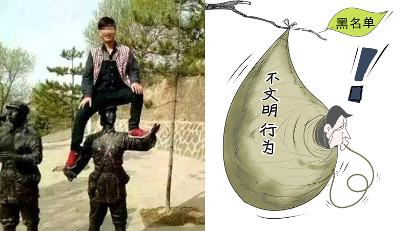 此外,四人中李某的不良信息在黑名单上保留的时间最长。李某在今年四月爬上红军雕像并坐在其头上拍照,他的信息因此将会在黑名单上保留十年。