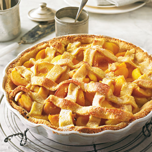 6. 剩下的面团用少量面粉擀至0.5厘米厚,并切成1厘米宽的面条,一条一条呈网格状放在馅儿上。将蛋黄加一汤匙水搅拌,然后涂抹在面条网格上,再将剩下的白糖撒在上面。
