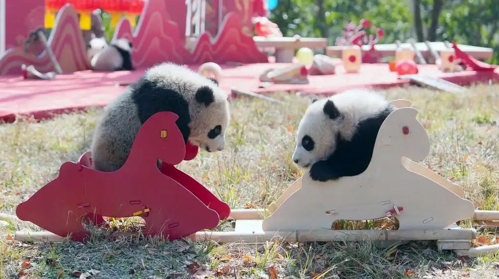 Dreißig Panda-Jungtiere versammelten sich am Mittwoch an zwei Aufzuchtstationen in der südwestchinesischen Provinz Sichuan, um über eine Videoverbindung Frühlingsgrüße an alle Chinesen zu senden.