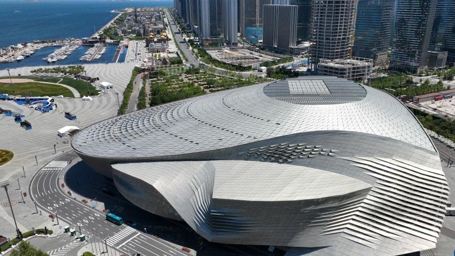 Die Drohnenaufnahme zeigt den Xinghai-Platz in Dalian in der nordostchinesischen Provinz Liaoning. Das Sommer-Davos-Forum 2024 wird vom 25. bis 27. Juni in der Küstenstadt Dalian stattfinden.