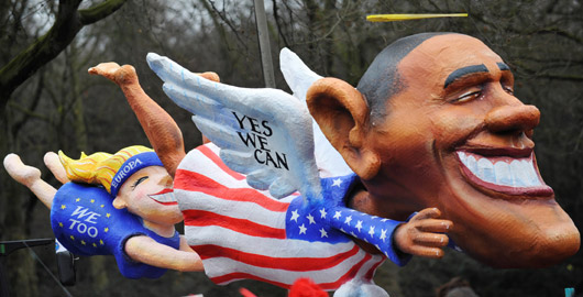 Der US-Präsident "Obama" verwandelt sich in einen Superman und fliegt in der Parade.