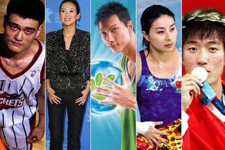 Von links nach rechts: Yao Ming, Zhang Ziyi, Yi Jianlian, Guo Jingjing, Liu Xiang (Bild: CRI English)
