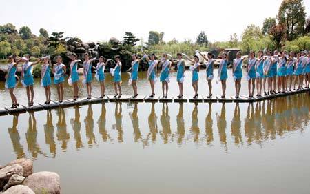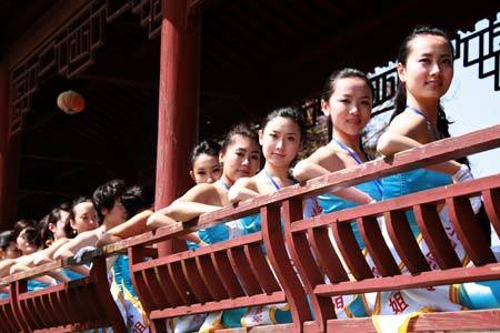 Mitstreiterinnen winken während der Vorausscheidung in Nordchina für den Wettbewerb der Miss Tourism International (MIT) 2009 im Garten Bao in Huangshan in die Kamera.