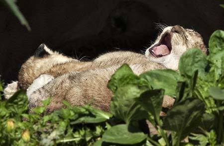 Ein frischgeborenes Löwenbaby gähnt am 28. Mai 2009 im Aalborg Zoo in die Kamera. Der Ort befindet sich im Norden des dänischen Jütlands. Die Löwin hatte vier Welpen in einer Höhle vor dem Löwenpark geboren.