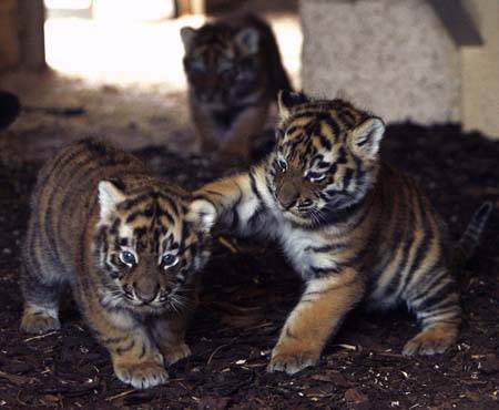 Fünf Wochen alte Amur-Tiger spielen zusammen am 16. Juni 2009 im Highland Wildlife Park in der Nähe von Kingussie in Schottland.
