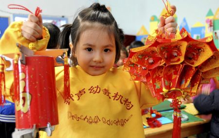 Ein Mädchen zeigt am 29. Dezember ihre handgefertigten Laternen im Zhongsheng-Kindergarten in Lianyungang, einer Hafenstadt in der ostchinesischen Provinz Jiangsu. Die Tätigkeit, welche die Stärkung des Umweltbewusstseins bei Kindern fördern soll, wurde hier am Dienstag durchgeführt. Die Kinder aus dem In- und Ausland mussten zahlreiche Neujahrslaternen aus Abfallprodukten herstellen.