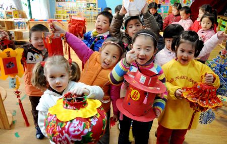 Kinder zeigen ihre handgefertigten Laternen im Zhongsheng-Kindergarten in Lianyungang (29. Dezember 2009).
