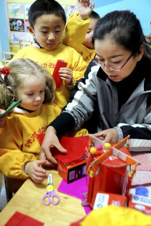 Ein ausländisches Mädchen lernt im Zhongsheng-Kindergarten in Lianyungang, Laternen zu fertigen (29. Dezember 2009).