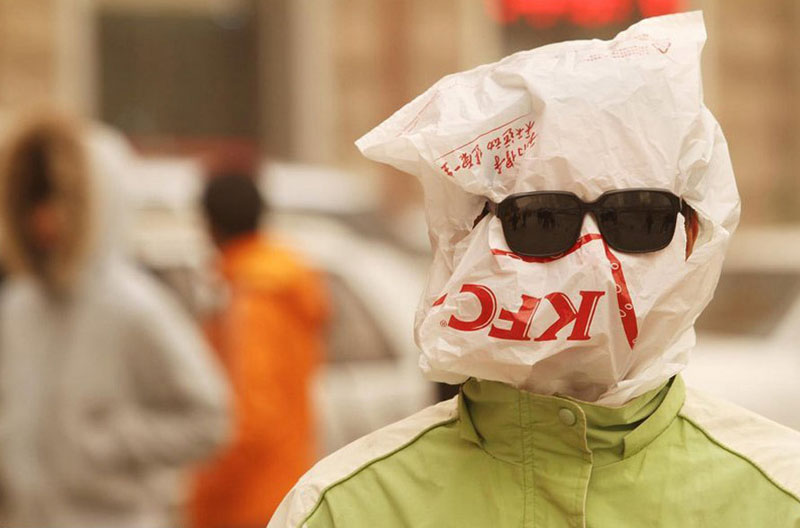 Ein Fußgänger bedeckte am 22. März in Beijing sein Gesicht mit einem Plastiksack. Bei dem Sandsturm bliesen Winde mit einer Geschwindigkeit von bis zu 100 Stundenkilometer. Auf einem rund zwei Millionen Quadratkilometer großen Gebiet waren mehr als 270 Millionen Menschen in 16 Provinzen von dem Unwetter betroffen. [Chinanews.com.cn]