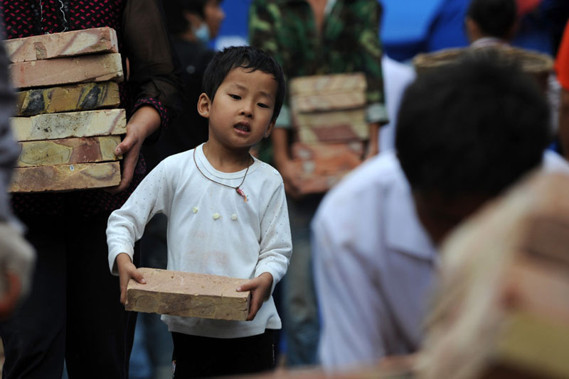 Ein vierjähriges Kind half am 13. August in Zhouqu mit. Die Region war von einer verheerenden Schlammlawine heimgesucht worden. [Xinhua]