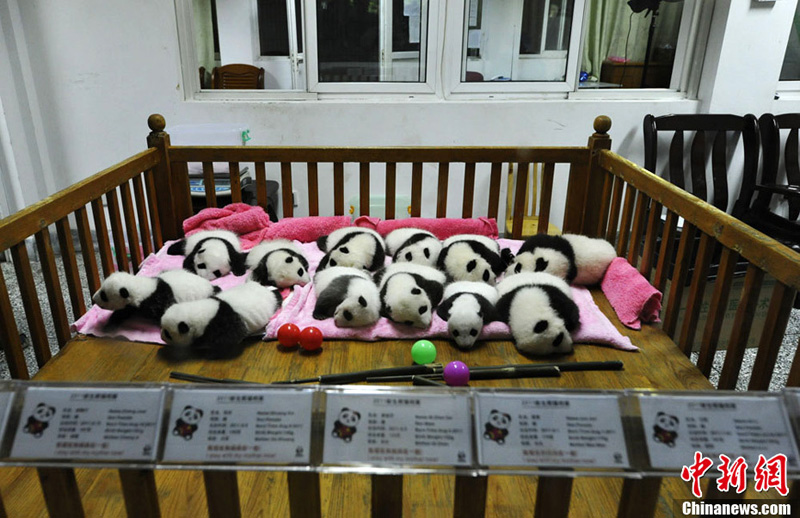 Zwölf neugeborene Pandababys, alle in diesem Jahr geboren, wurden am Montag zum ersten Mal dem Publikum in der Forschungsbasis für Pandazucht vorgestellt.